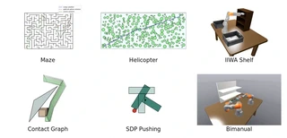 Representative GCS benchmark instance families spanning maze, helicopter, shelf, contact-graph, SDP pushing, and bimanual problems.Motivation